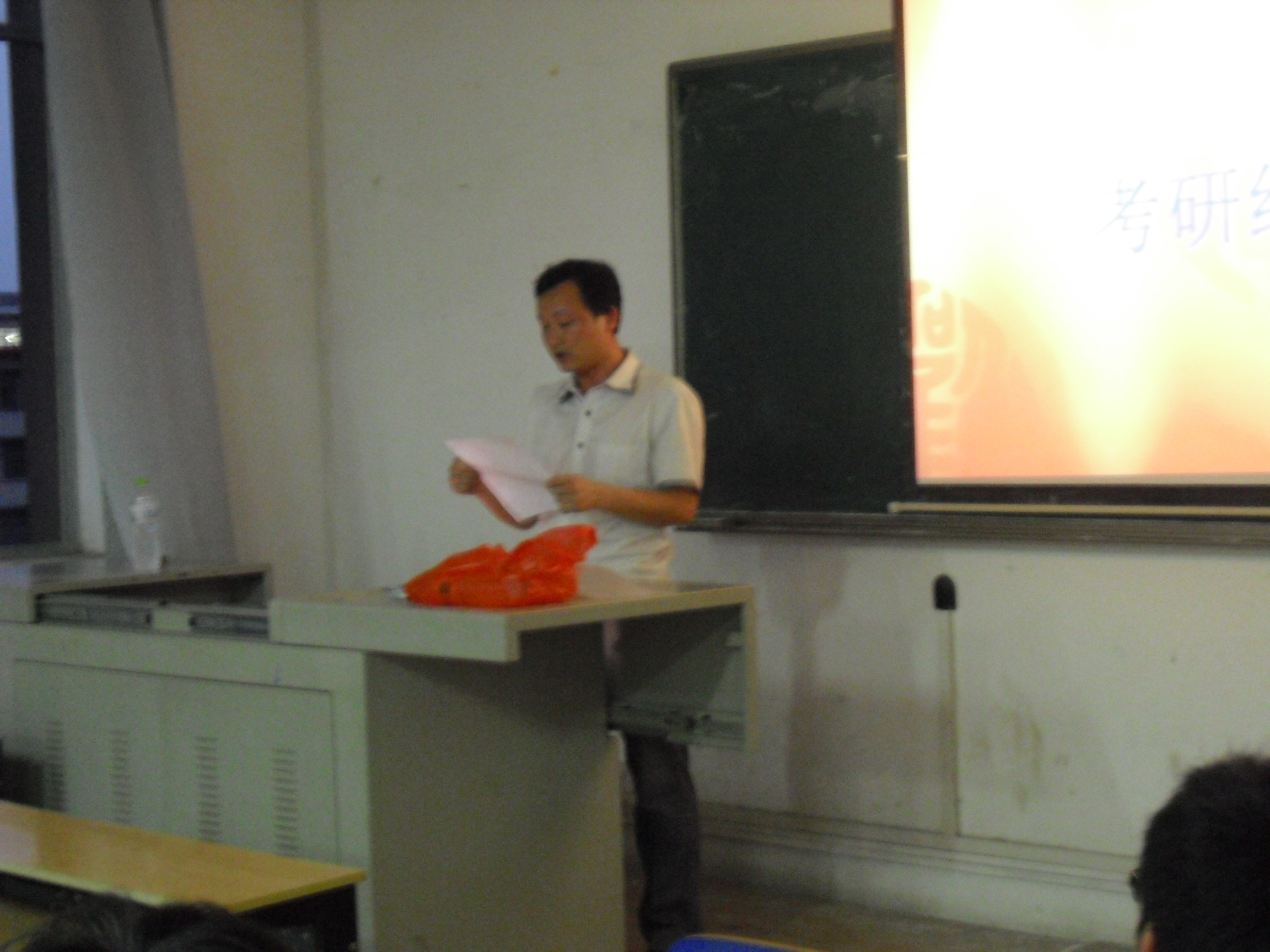 活动在主持人完美的主持词中拉开帷幕。首先李主任致开幕词,一方面对考研毕业生表示祝贺,另一方面对下届毕业生寄予厚望。接着由本届考研精英依次上台自我讲述各自的考验心得、经验以及考研历程。期间,考分最高、考上中南大学的孟亚军同学特别分析了当前考研的形势和考研秘诀,希望弟弟妹妹们在考研的道路上少走弯路,一举成功。最后,李主任也阐述了自己的考研经历与经验,与在座的每一个同学共勉,鼓励大家实现考研梦。