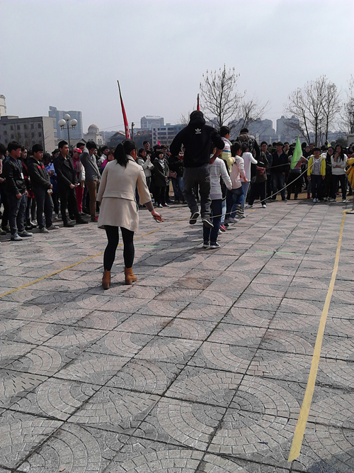 的学生会组织同学们于学海花园集合,开始布置会场迎接下午的活动。中午12时许,各个学院的参赛队伍陆续到达会场。活动以布偶表演开场,之后进行了拔河、接力、跳绳比赛。其间以花样接力赛最激烈,最逗人发笑。