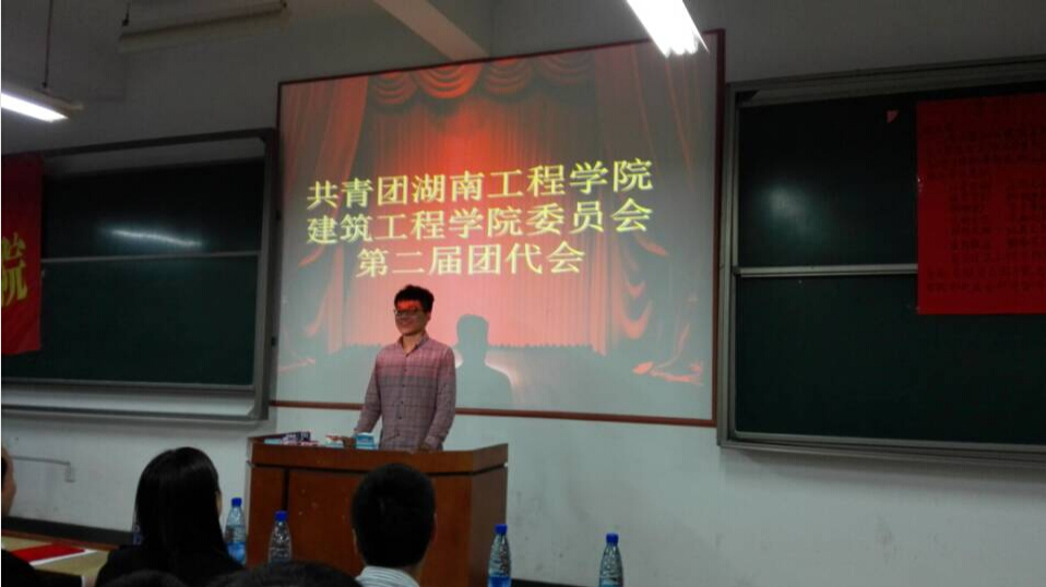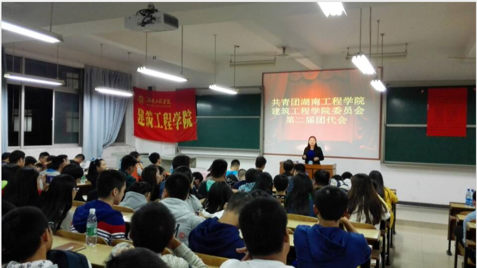 2015年10月28日晚,湖南工程学院建筑工程学院第二届团代会在主校区D座202教室召开,建筑工程学院学生办公室主任李佳老师为大会开幕式致词,建筑工程学院团总支书记唐喜梅老师出席会议并讲话,建筑工程学院团总支副书记夏哲凡作为团员代表发言。