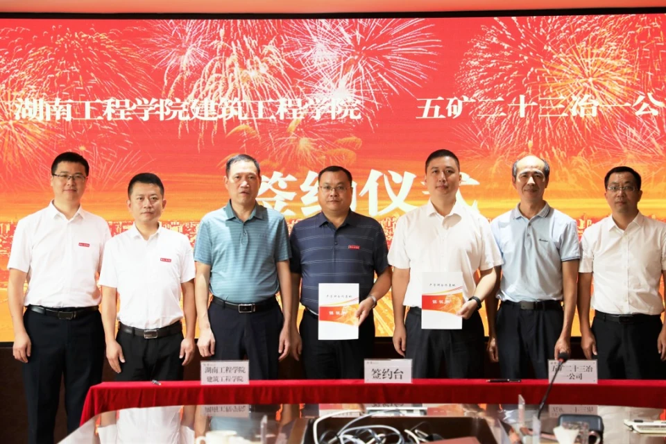 与五矿二十三冶建设集团第一工程有限公司签署校地产学研合作协议。院党委书记张宏、院长李小华、党委副书记梁桥等出席签约仪式。