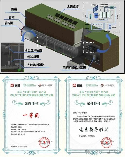 “基于相变储能与太阳能溶液除湿的定向追踪空调器”该作品创新性提出了地铁盾构隧道空调系统,通过相变储能的削峰填谷极大减少了系统装机容量,同时利用太阳能与溶液除湿耦合的新风处理装置降低隧道内部湿度。送风末端的定向追踪系统在保障人员热舒适的前提下极大降低冷负荷需求。为推动我国隧道通风制冷的节能减排发展做出了积极的贡献。