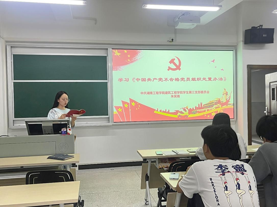 活动伊始,朱笑雨带领全体党员学习《中国共产党不合格党员组织处置办法》,会上主要针对四个内容进行了学习解读:一是学习组织处置的总体要求、概念和方式、原则等作出的规定;二是文件中关于限期改正、劝其退党和除名的适用情形,细化处置程序及后续事项;三是对可以不予处置的情形、合并处置等应把握的政策要求;四是组织处置的工作责任、工作纪律等内容。与此同时提醒全体党员要学好用好《党的二十届三中全会<决定>学习辅导百问》等辅导资料,真正将党的二十届三中全会精神实质准确把握。
