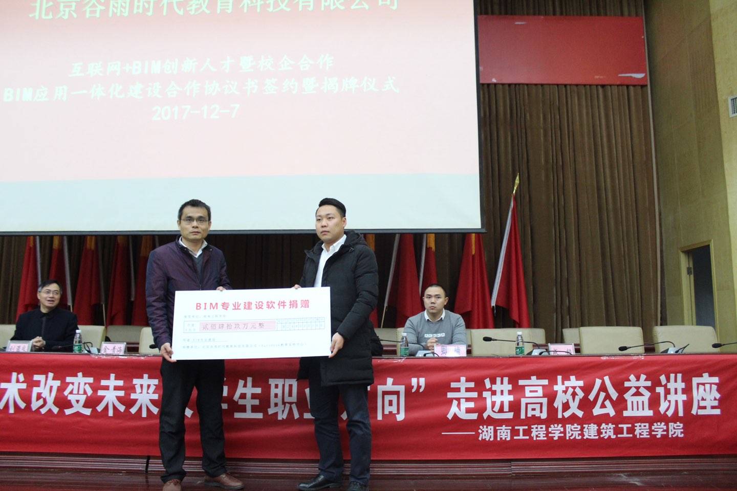 2017年12月7日下午,由建筑工程学院与北京谷雨时代教育科技有限公司合作成立的BIM工程技术中心在图书馆一报告厅举行合作协议签约和成立仪式。建筑工程学院副院长陈晓代表学院签约,并接受北京谷雨时代向BIM工程技术中心捐赠的价值249万元的正版BIM软件。随后举行了湖南省第二届“BIM技术改变未来大学生职业方向”走进高校公益讲座。首先,北京谷雨时代教育科技有限公司副总经理金青海先生围绕BIM人才培养进行了专题讲座。然后,来自湖南省建筑科学研究院、中机国际工程设计研究院、湖南交通职业技术学院的专家教授分别就BIM在建筑设计中的应用、BIM技术在工程管理中的应用、BIM教育教学等问题做了专题讲座。建筑工程学院师生300余人聆听了讲座。