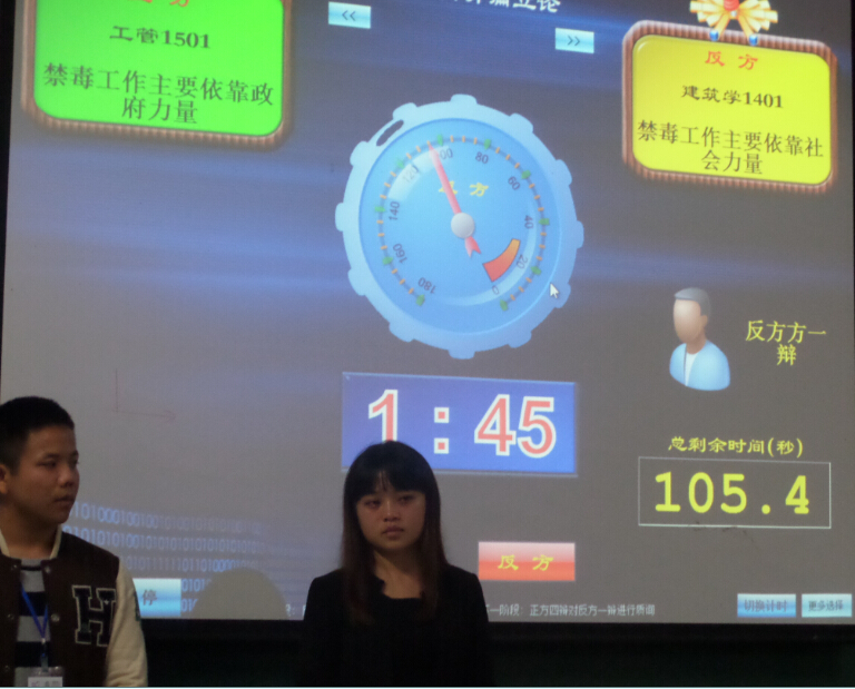 比赛在激烈的掌声中拉开帷幕,正方辩手开篇立论,首先指出政府对吸毒者的警告和预防作用,接着用具体事例和数据说明了政府在禁毒工作中的重要作用,坚持禁毒工作主要依靠政府力量。反方辩手则从人民群众的配合度来说明社会力量的重要性,坚持禁毒工作主要依靠社会力量之后进入了攻辩环节,正反方辩手旁征博引,都表现的十分出色接下来的自由辩论更是将比赛推向了高潮,双方辩手都最大限度的表达己见并驳回对方观点,双方四辩最后做总结陈词,更加有力的点明立场之后的评委、嘉宾和观众的提问也让我们对禁毒有了更深一步的了解辩论结束后,院辩论代表在点评中充分肯定了双方辩手的优秀表现,并就选手存在的不足之处提出建议最终建筑学1401班的辩论队取得了此场比赛的胜利。