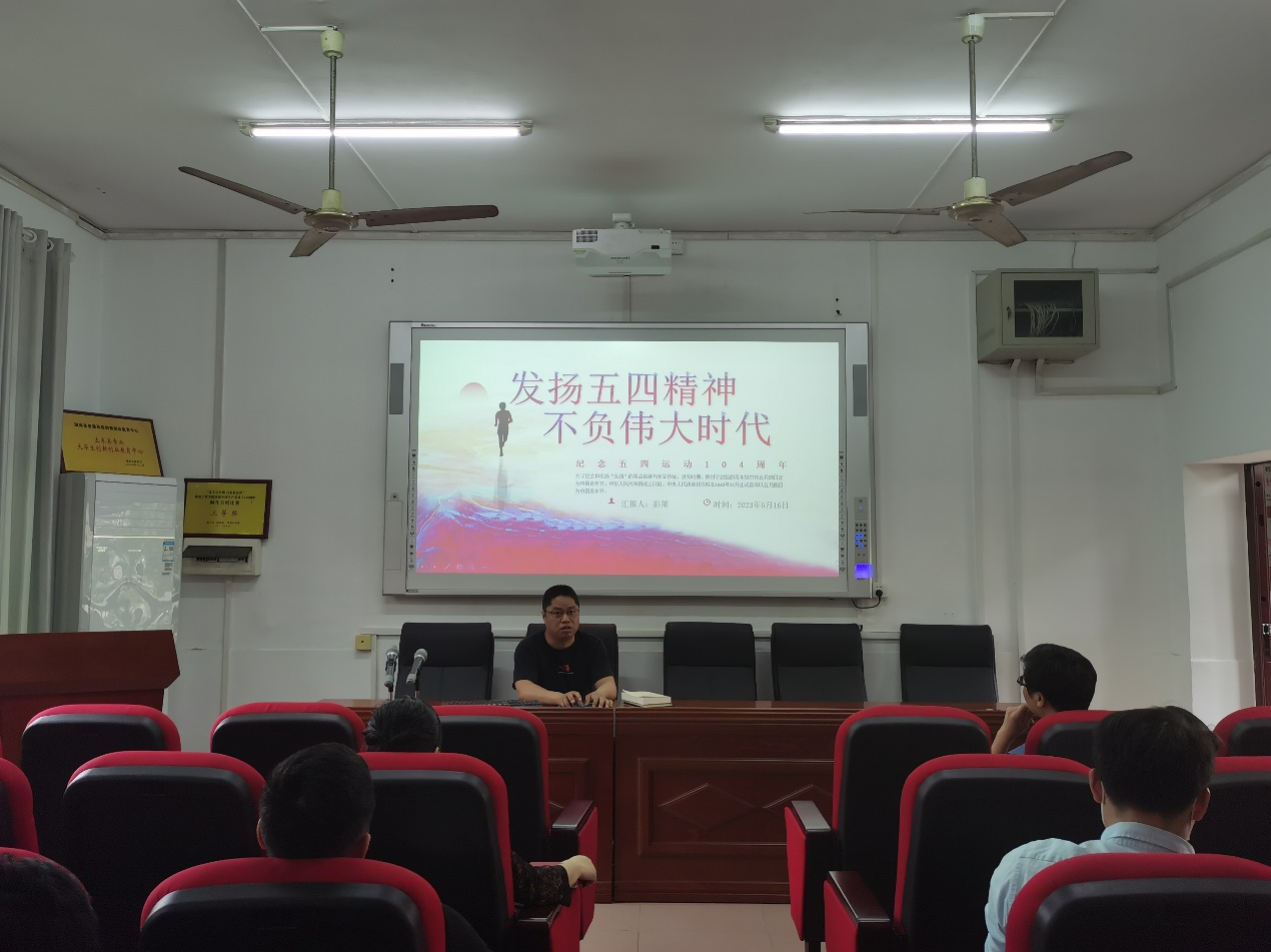 首先,支部书记彭第同志以“发扬五四精神、不负伟大时代”为题讲授一堂党课。党课内容紧扣2019年习近平总书记在纪念五四运动100周年大会上的重要讲话精神,内容包括四个方面:什么是五四精神;五四精神的内涵;五四精神的当代体现,当代青年如何传承五四精神。