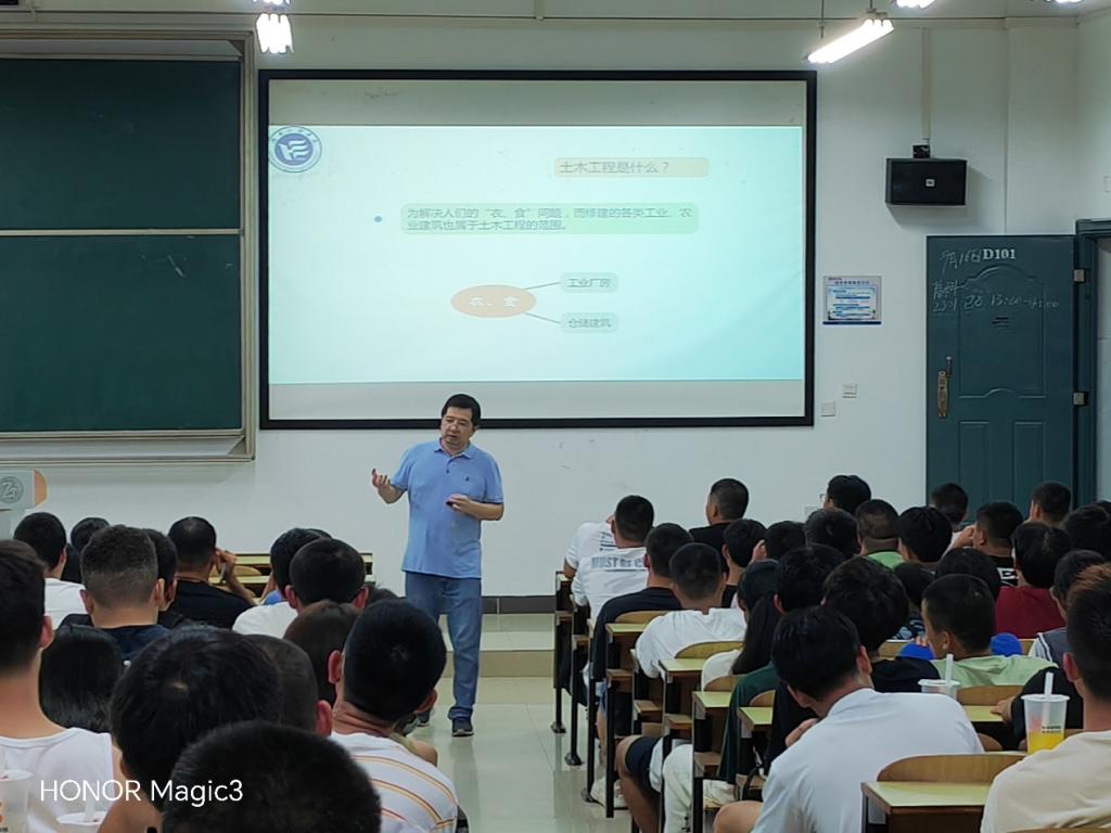 在一教D栋101教室召开土木工程专业教育暨方向介绍会,由教研室主任刘兆丰副教授和土木工程专业博士肖阿林为2023级土木专业新生进行专业教育及各方向介绍。