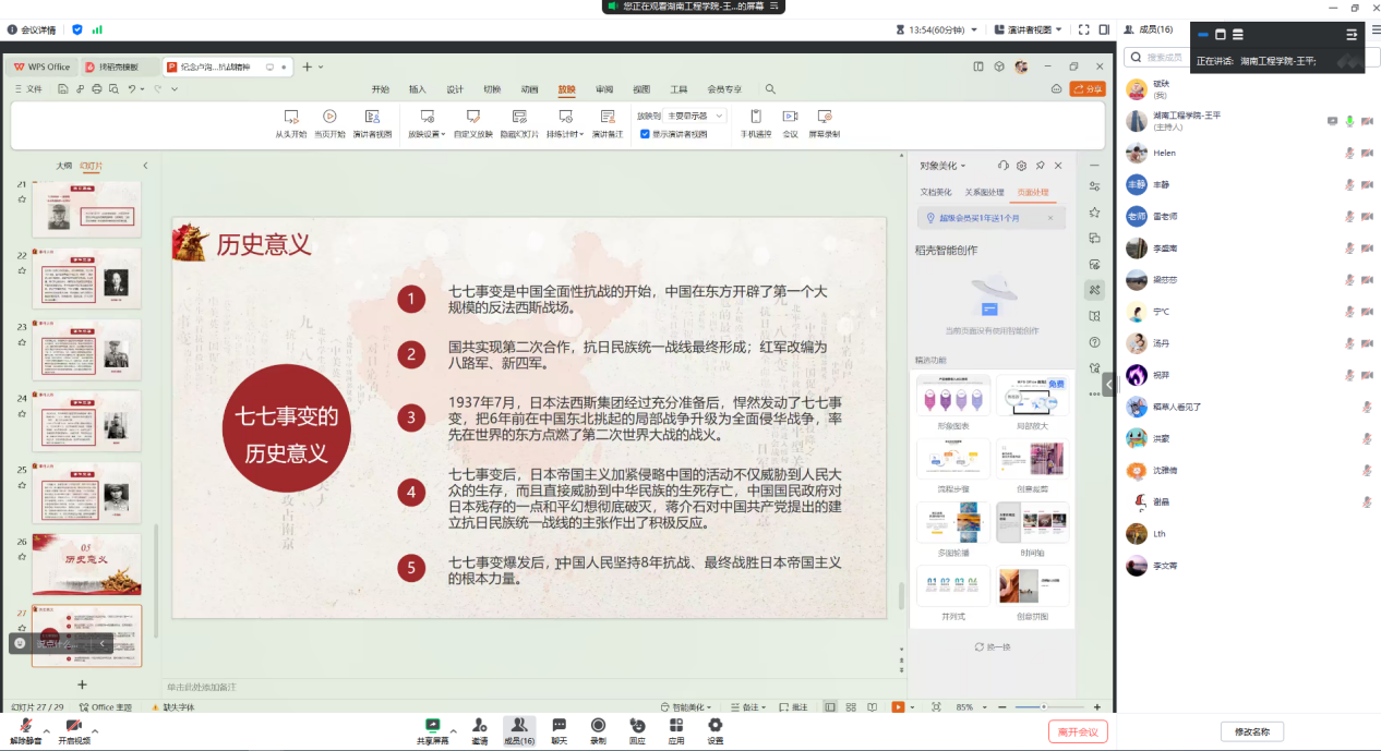随后教工第一党支部李盛南以《纪念抗战胜利78周年》的主题,结合“抗日历史我了解”、“勿忘使命记心间”讲述了我国抗战史,并表示现在的幸福生活是全党努力奋斗得来的,作为党员教师要将此奋斗历程记心间,向学生进行爱国主义教育。