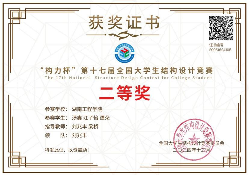 2024 年 11 月 7 日至 11 月 10 日,“构力杯”全国大学生结构设计竞赛在广州大学隆重举办。湖南工程学院派出了一支由土木工程 2201 班的江子怡、土木工程 2202 班的汤鑫、土木工程 2206 班的谭朵组成的参赛队伍,在指导老师刘兆丰、梁桥、沈雅倩的精心指导下,凭借卓越的表现荣获全国二等奖。